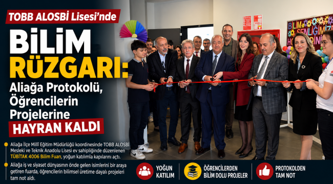 Aliağa İlçe Millî Eğitim Müdürlüğü koordinesinde TOBB ALOSBİ Mesleki ve Teknik Anadolu Lisesi ev sahipliğinde düzenlenen TÜBİTAK 4006 Bilim Fuarı, yoğun katılımla kapılarını açtı. Aliağa iş ve siyaset dünyasının önde gelen isimlerini bir araya getiren fuarda, öğrencilerin bilimsel üretime dayalı projeleri tam not aldı.